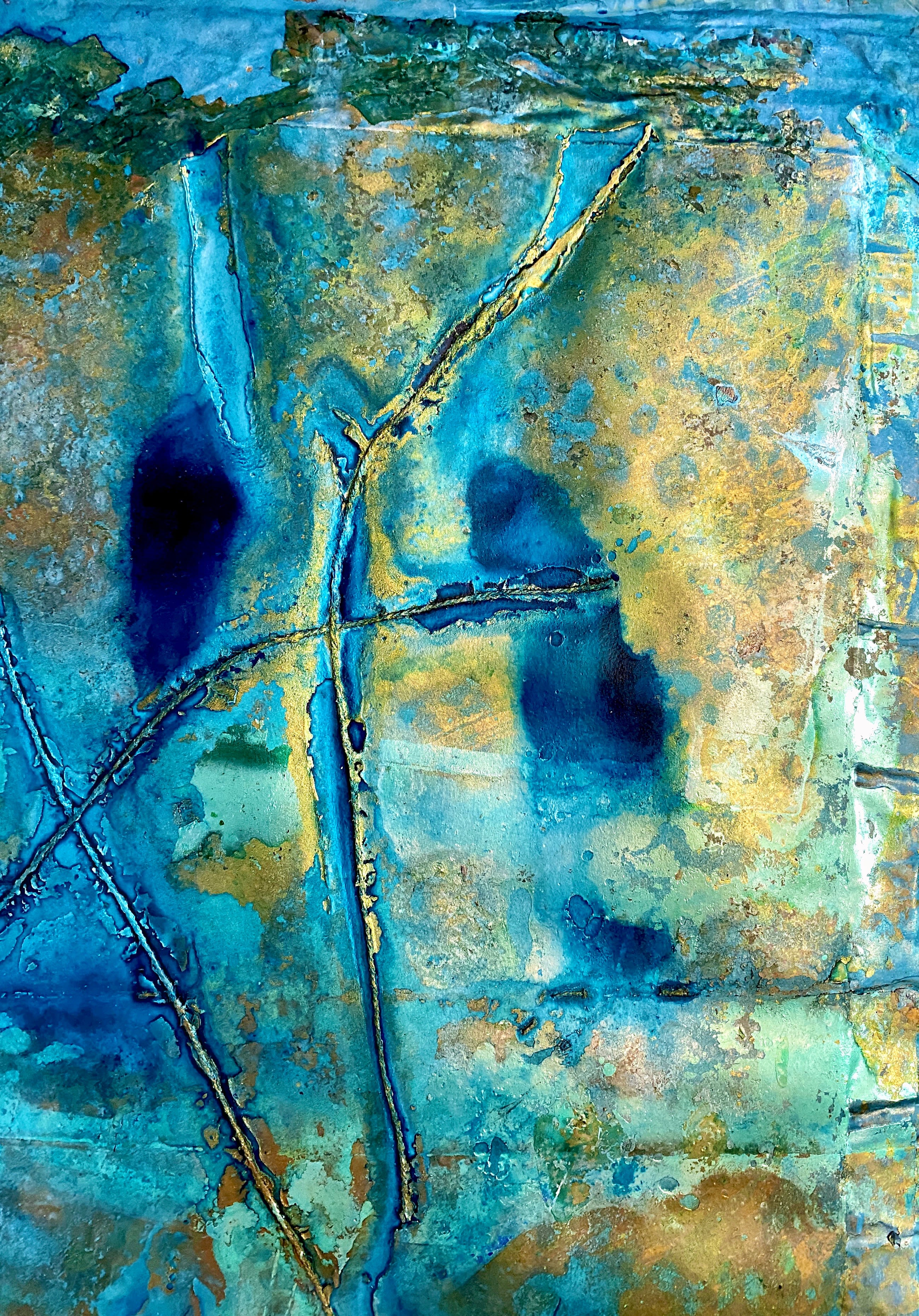 As I sat with the paintings, looking into a field of shimmering blue and gold, I wondered about the deep scarification lines imprinted in the soft folds of the watercolour paper. These folds reminded me of something and someone - I couldn't quite remember...