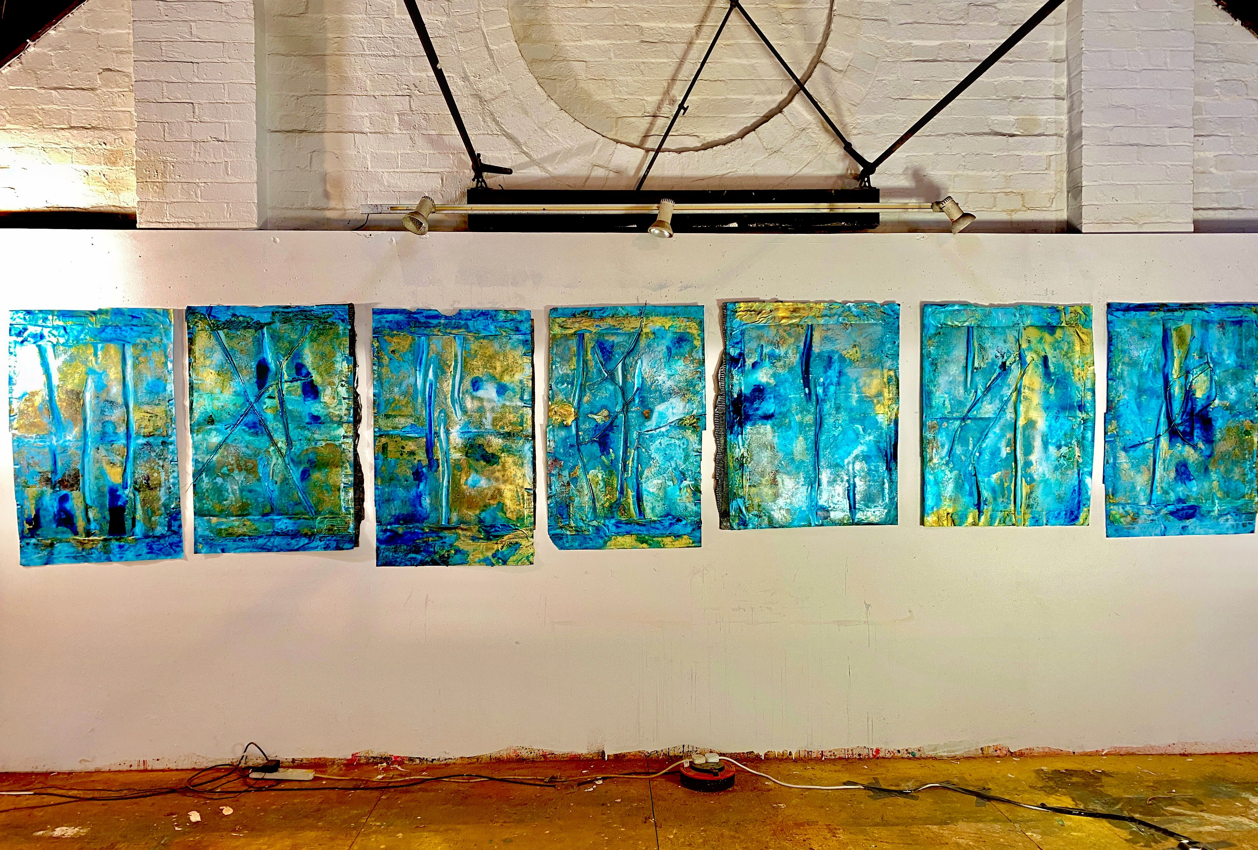 Series of 12 works on constructed watercolour paper, acrylics, ink, gold dust - 110cm x 80cm (pictured in situ in my studio - Harlesden, London)