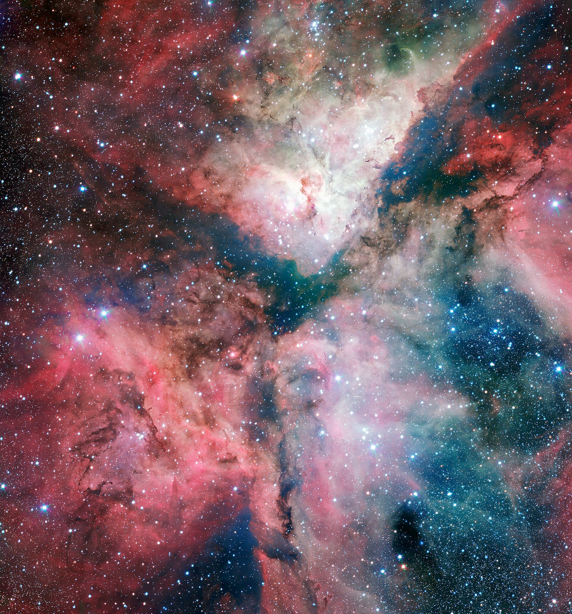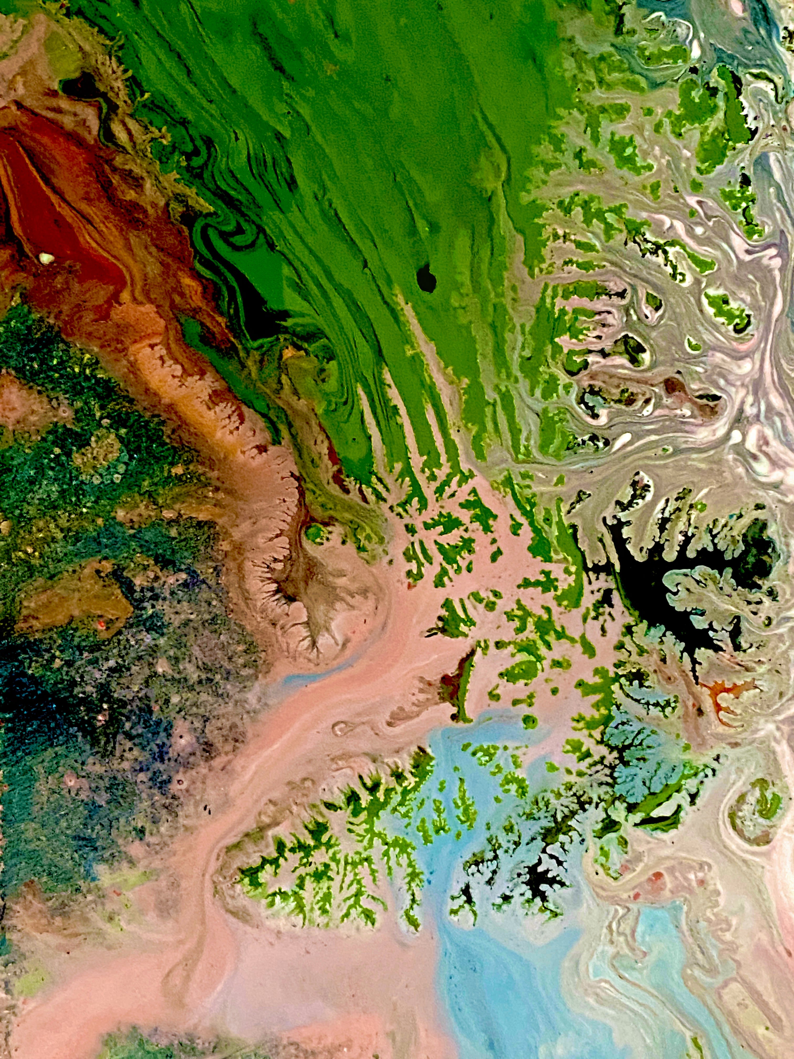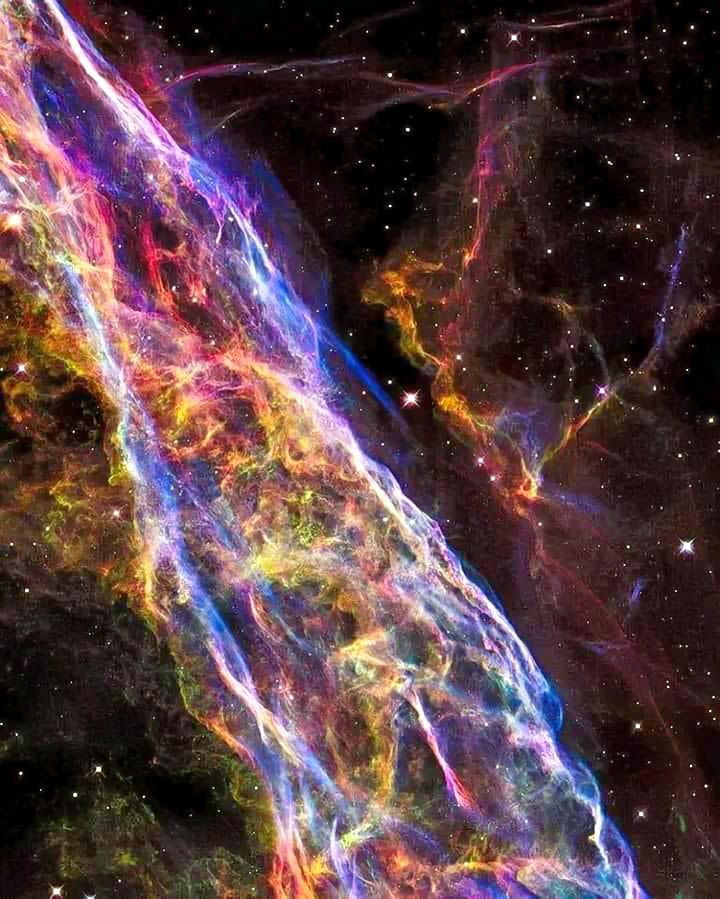 Below scatterings of Visual Medicine™ paintings interspersed with photos from James Webb telescope showing the birth of a nebula, fungi at the bottom of a glass, Tasmanian tree fern, a map of the actual shape of the Universe - Laniakea, and rare formations of rainbow clouds.